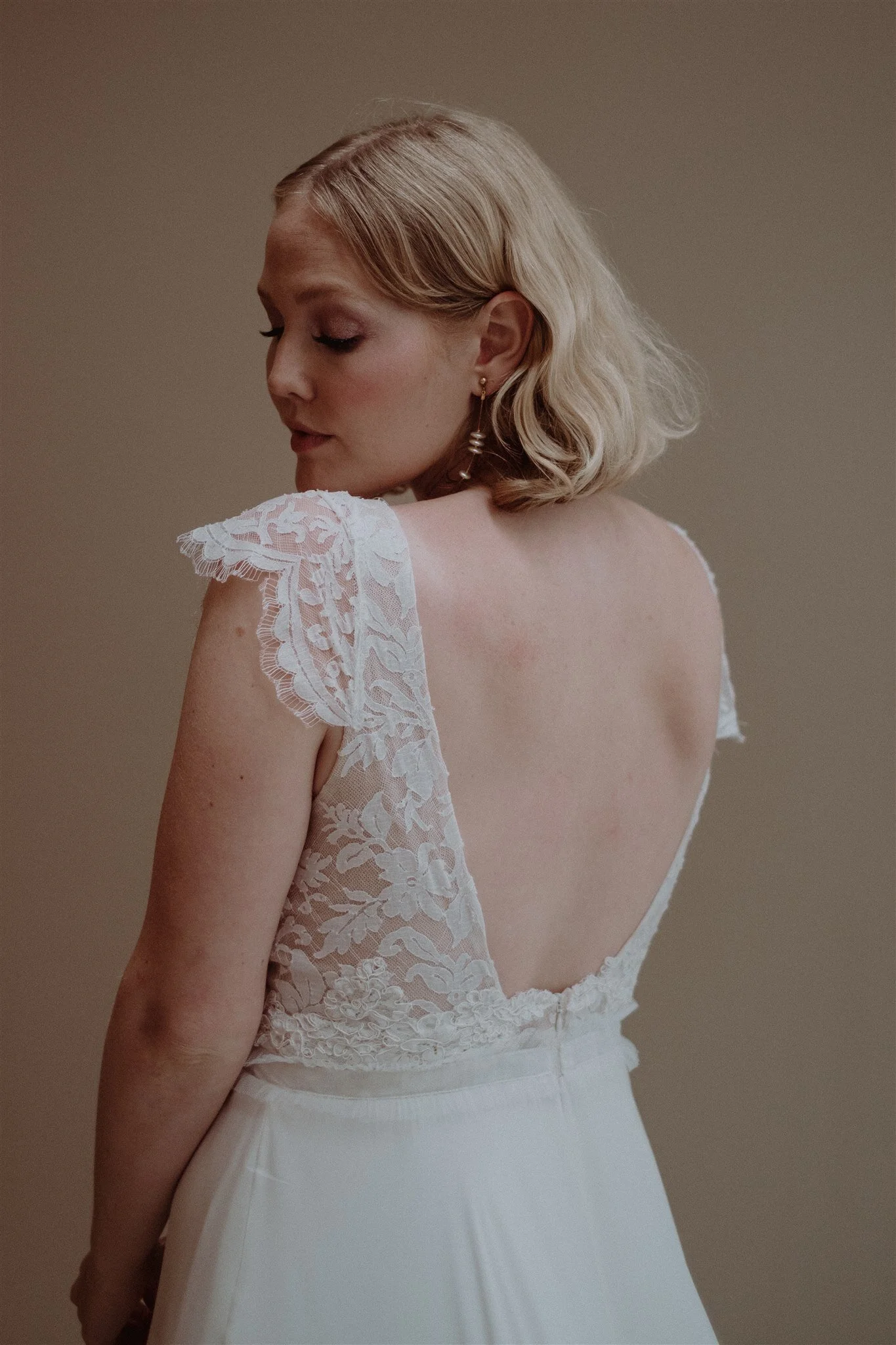 Evelyn is created with cotton bobbinet and French floral lace, a silk crepe skirt, with recycled poly stretch charmeuse lining.