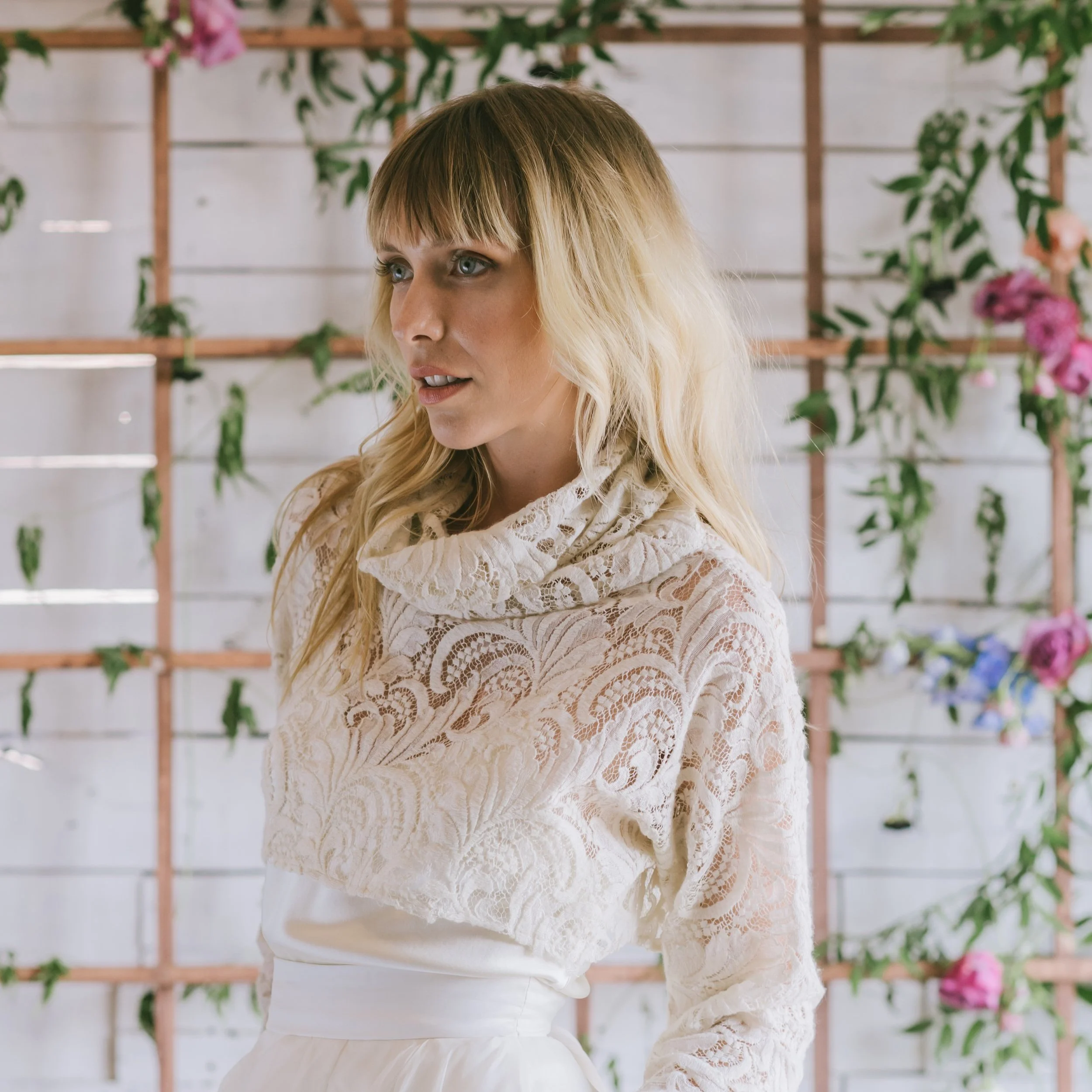 Malva is the cover up you don’t want- you NEED. The softest and coziest French wool lace in an effortlessly chic cropped pullover sweater with a lace cowl neck and silk charmeuse cuffs? Yes, please! They just don’t make bridal cover ups this cool.